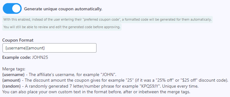 You can combine these merge tags with static text (like WELCOME- or SAVEWITH) to create your ideal coupon structure. Personalised codes often perform better because they build trust between the affiliate and their audience.