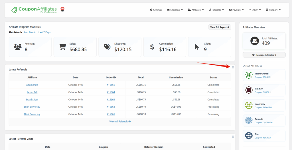 The “Affiliate Program Statistics” now also shows “This Month” as the default, with “Last 7 Days” moved to the last option.
