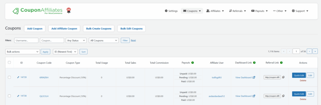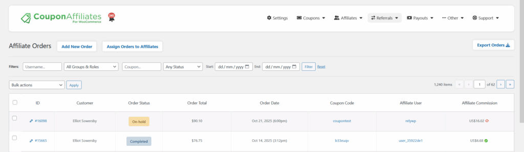 - The core WooCommerce orders page “Coupon Affiliate” column now shows the coupon, user, and commission.