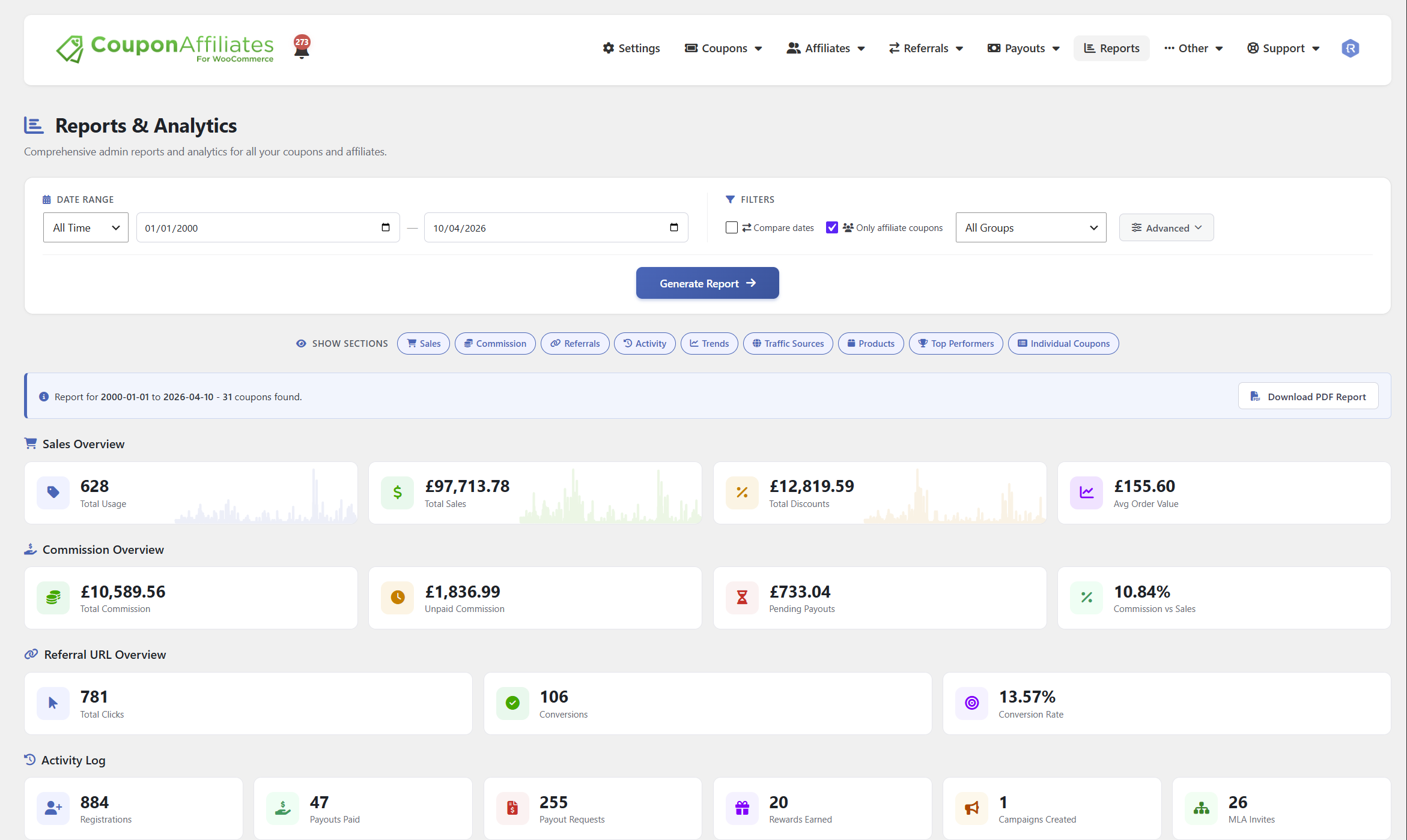 Sie sind noch kein Coupon Affiliates-Benutzer? Wir haben das Coupon Affiliates Plugin entwickelt, um WooCommerce-Shops jeder Größe bei der Erstellung und Verwaltung ihrer Partnerprogramme zu unterstützen. Mehr als 4.700 WooCommerce-Shops vertrauen Coupon Affiliates und haben ihm eine Bewertung von 4,9 von 5. Es verfolgt automatisch die Analysen Ihres Programms und ermöglicht Ihnen den Zugriff auf die wichtigsten KPIs und Metriken für Ihr Partnerprogramm. Sehen Sie sich die kostenlose Version oder holen Sie die Pro-Version (mit einer 7-tägigen kostenlosen Testversion).