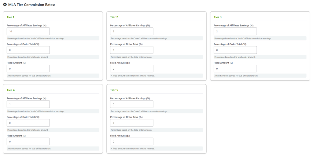 Los "Niveles de Afiliación Multinivel" son los ajustes principales que debes personalizar. Puedes elegir los porcentajes de comisión para cada nivel y tener un número infinito de ellos.
