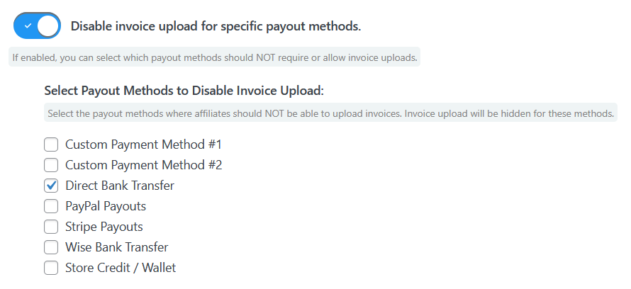 You can now disable the “invoice upload” for specific payout methods, giving you more flexibility in managing affiliate payouts.