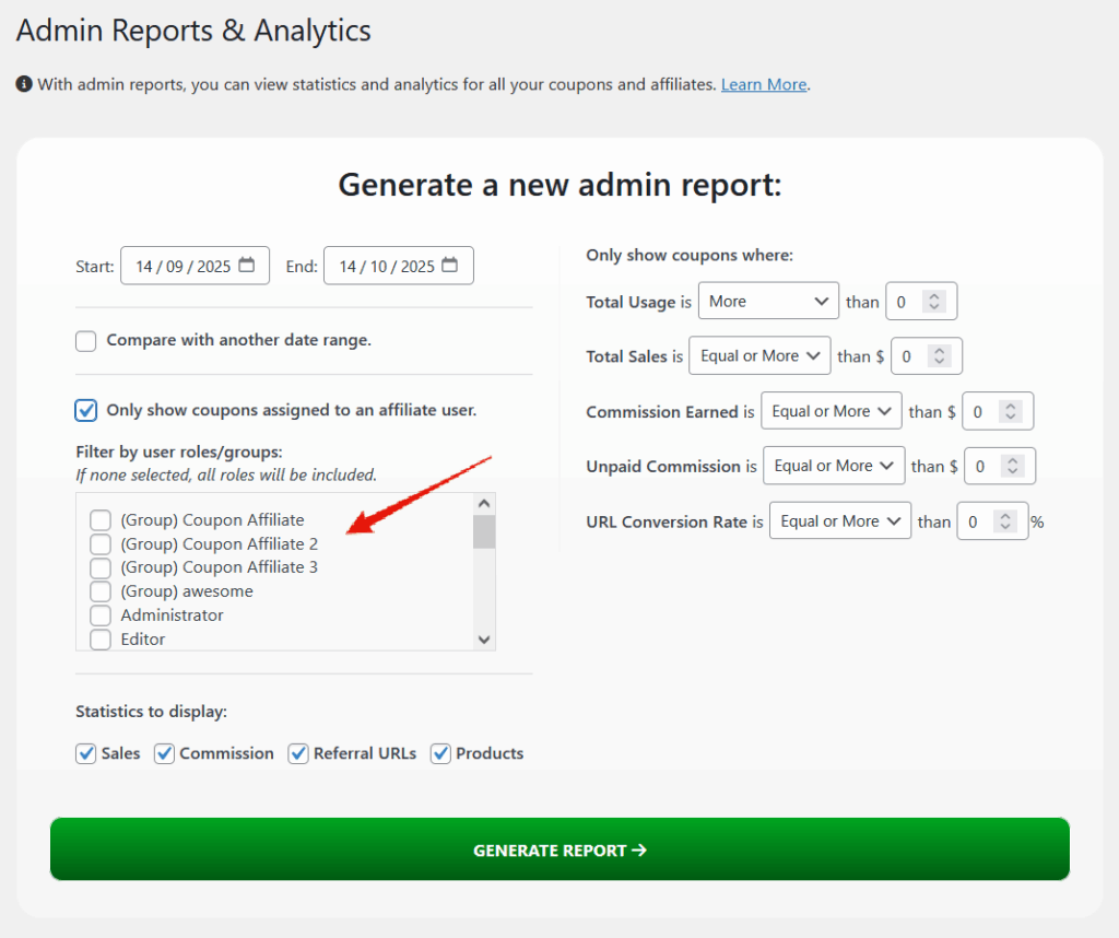 Admin reports now include an option to filter by user group or role when “only show coupons assigned to an affiliate user” is enabled. This gives you more granular control over your analytics and helps you better understand affiliate performance across different segments.