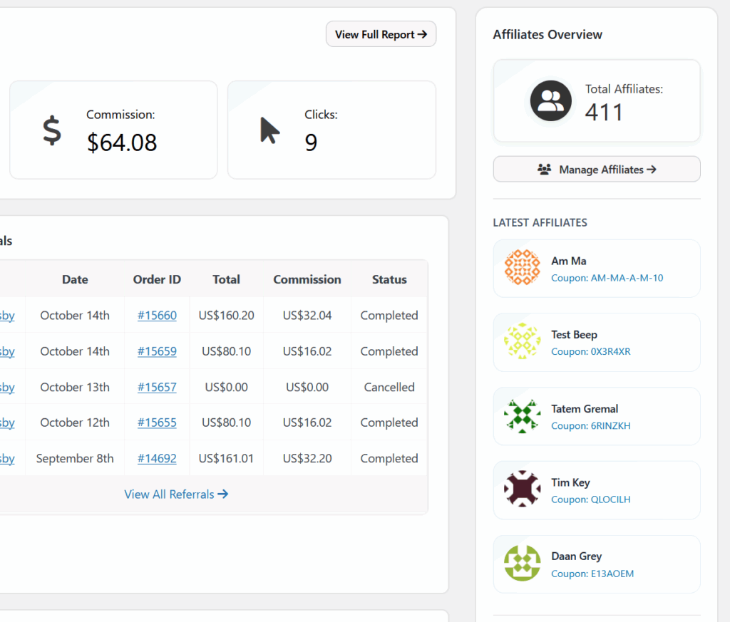 The admin dashboard now includes a sidebar with an “Affiliate Overview” section. Instantly view the total number of affiliates, see the latest signups, and identify your top performers. This gives you a clear snapshot of your program’s health at a glance.