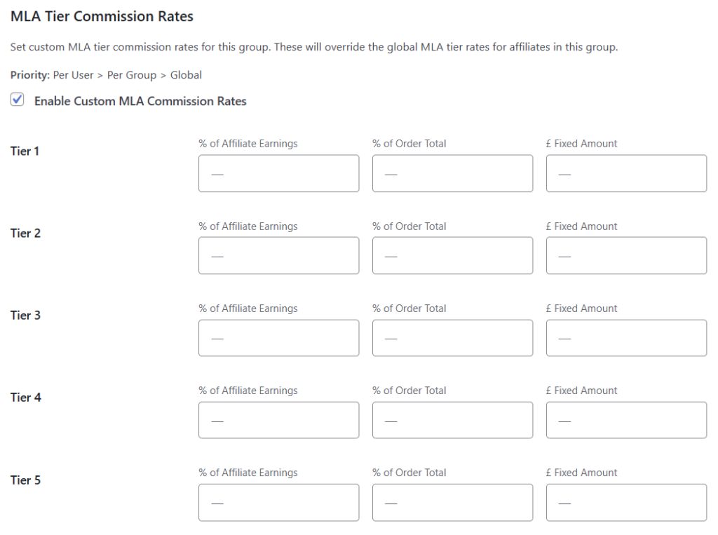 Once enabled, you will then see options to set custom commission rates for each tier when editing a group or user.