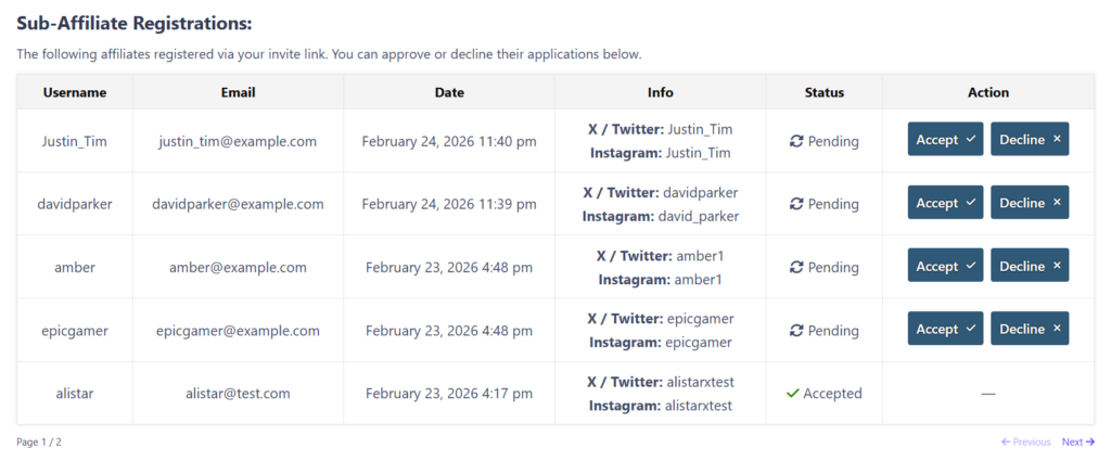 They’ll also receive email notifications when new sub-affiliate applications come in, and can approve or reject them directly from the MLA dashboard.