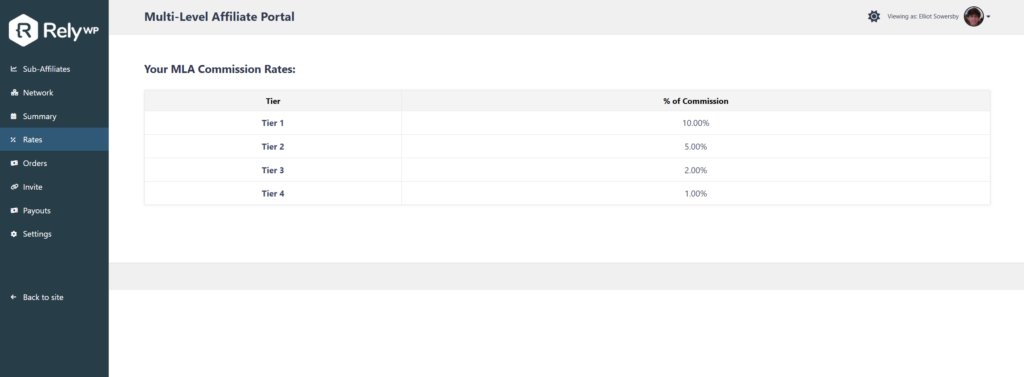 You can now enable a dedicated “Rates” tab on their MLA dashboard, showing the commission rates for each tier in their network – including any custom rates that have been set for them specifically.