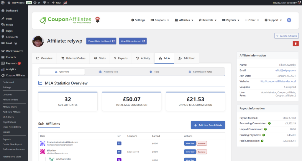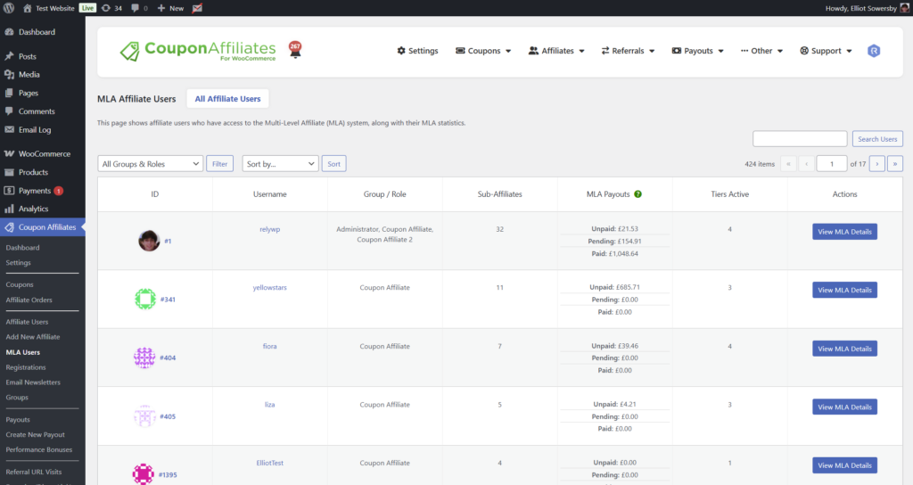 A brand new “MLA Users” admin page has been added, giving you a full list of all users that are part of your multi-level affiliate system, along with their affiliate details and stats – all in one place.